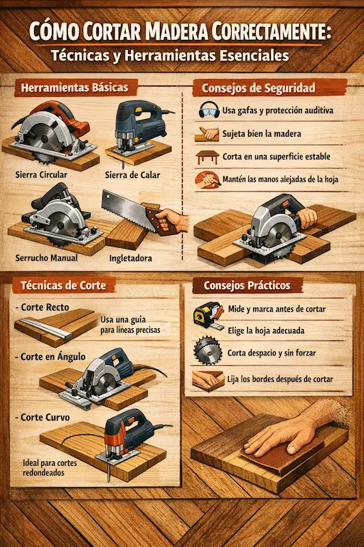 En esta guía completa aprenderás paso a paso cómo cortar madera correctamente, qué herramientas usar, los tipos de corte más importantes y los errores que debes evitar.